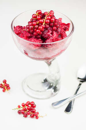 Delicious raspberry sorbet in glass on white background