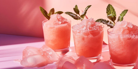 Pink sorbet in a clear glass, topped with fluffy texture, set against a bright pink backdrop, creating a vibrant and refreshing summer dessert atmosphere, AI generated