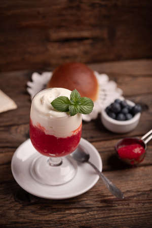 Ice cream with raspberries, lemon and mint in a glass