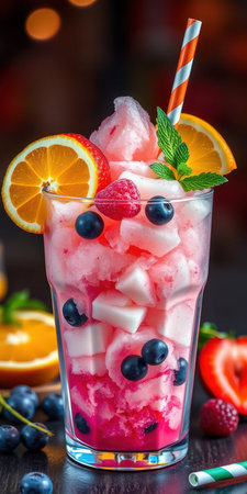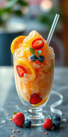 Colorful frozen fruit dessert served in a glass with fresh berries and citrus slices
