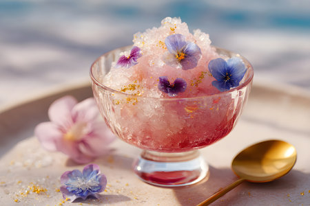 A delicious dessert sits in a clear glass bowl, featuring crushed ice, vibrant flowers, and a golden spoon. The setting is bright and sunny, ideal for enjoying a cool treat.
