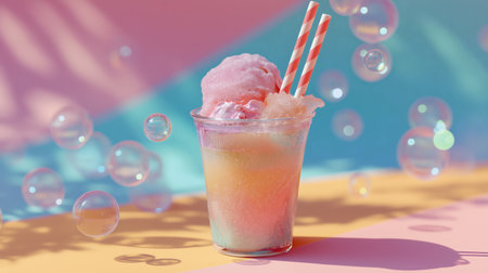A vibrant rainbow slush topped with pink cotton candy and striped paper straws, served in a clear cup surrounded by floating bubbles, set against a dreamy pastel background of pink, blue, and yellow.