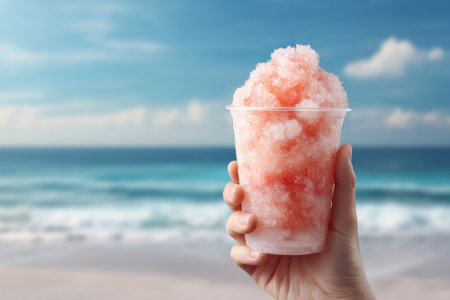 Hand holding a refreshing pink granita with a blurred seascape in the background, perfect for a hot summer day