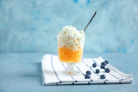 Glass with tasty shaved ice on table