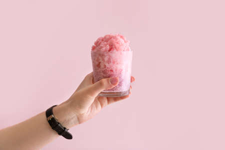 Female hand holding glass of tasty shaved ice on color background