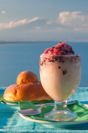 A delicious breakfast with strawberry granita and brioches, sicily, close up