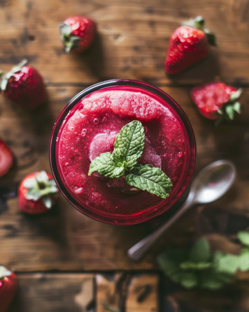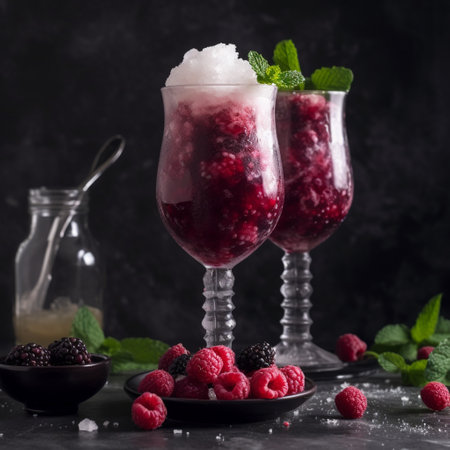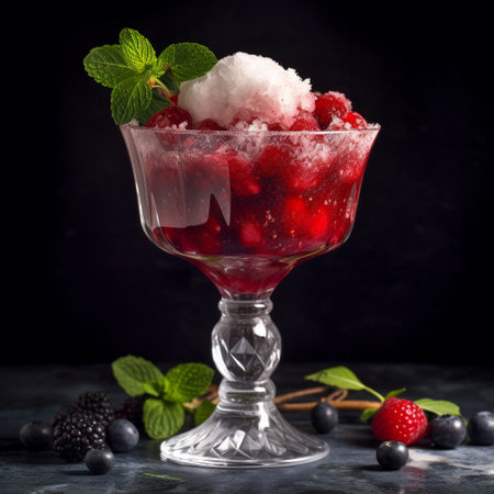 This tall glass of berry granita is the perfect treat for a hot day. Made from shaved ice and fruit syrup, this semi-frozen dessert has a sweet and refreshing flavor with a fruity and refreshing aroma. Served with a small spoon and garnished with fresh berries and mint leaves, this granita dessert is not only delicious but also visually stunning. The fresh berries surrounding the glass add to the overall sensory experience.