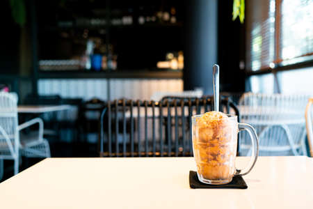 Thai tea ice scoop in glass on table in coffee shop cafe and restaurant