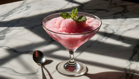 Strawberry sorbet in a glass with mint leaves on a marble table
