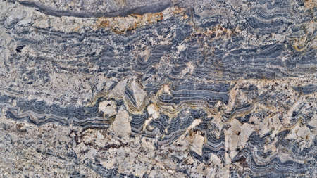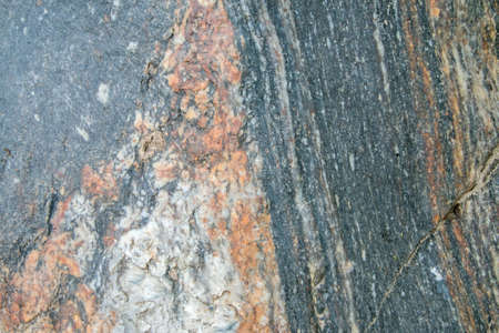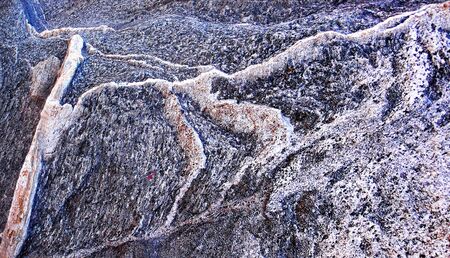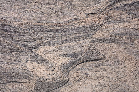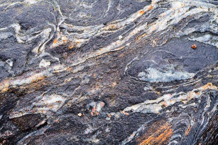 Close up of rock surface, gneiss with white folded quartz veins due to the power of geologic crustal movement