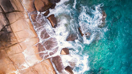 Aerial view of the ocean waves crashing on the rocks. Top view