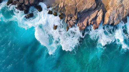 An aerial view presents waves crashing against a rugged, rocky shoreline. The image features shades of blue and turquoise water. The scene shows the interaction of water and stone, suggesting a coastal environment. Suitable for various commercial and editorial applications.