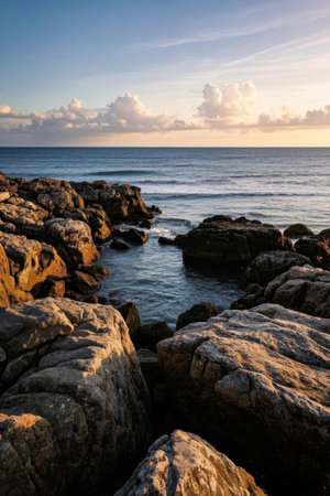 The shoreline features rugged rocks as waves roll in from the open sea, creating white foam against the textured stones during a beautiful sunset.