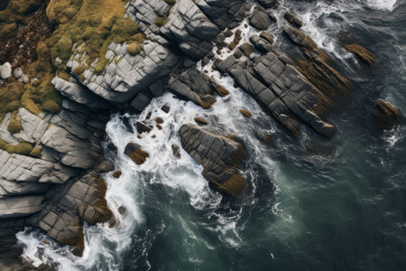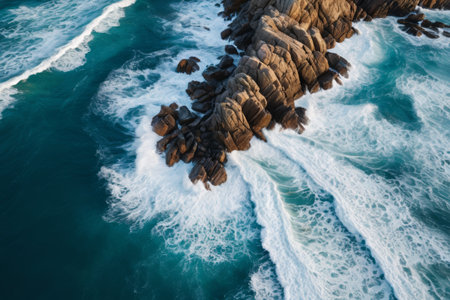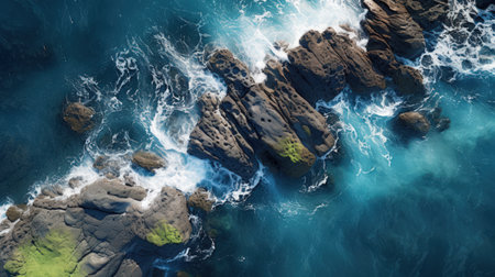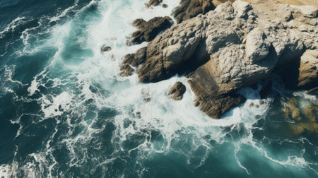 This photo captures a birds-eye view of the expansive ocean with crashing waves and rugged rocks along the coast, Surreal overhead scenery of soft sea waves dashing against rough rocks, AI Generated