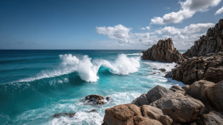 Turquoise waves roll powerfully towards the shore, colliding with rugged rocks beneath a clear blue sky. The scene captures the beauty of nature in a tranquil coastal setting.