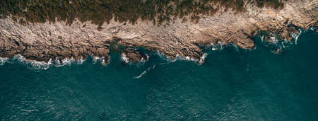 Dramatic marine background. Rocky coast of the Adriatic Sea. White foamy waves beat against the stone shore. Panorama of the sea coast. Aerial top view.