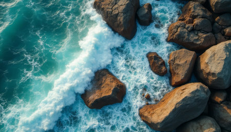 An aerial shot showcases a rugged coastline where vibrant turquoise waves surge against dark, textured rocks. The composition displays dynamic patterns of water and stone with overhead lighting. Suitable for environmental themes, it provides a visual for travel, nature, and coastal projects, offering versatile applications.