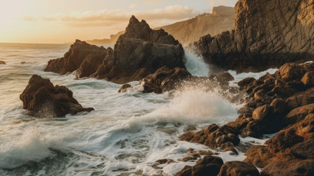 Majestic coastline, breaking waves, rocky cliffs, beauty in nature generated by artificial intelligence