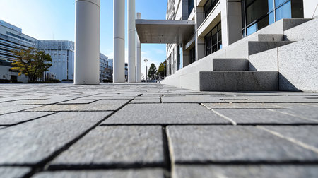 Dynamic low-angle perspective of a modern urban plaza. Geometric grey paving leads to white pillars and concrete steps, bathed in sunlight under a clear blue sky.