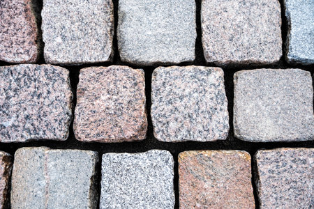 Detail of cobblestone sidewalk made of cubic stones.