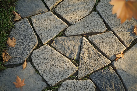 Top-down full frame shot of a gray stone paver walkway with sparse green grass between the stones and scattered brown autumn leaves.