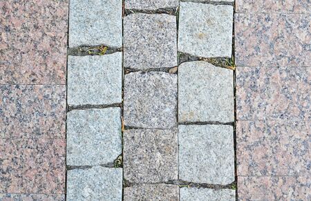 Bicolor stone cobblestone granite of walking street. View from above