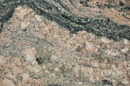 sample of raw gneissoid granite rock on black granite background close up from Karelia, Russia