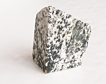 sample of raw gabbro-norite mineral on white marble background close up from Karelia, Russia