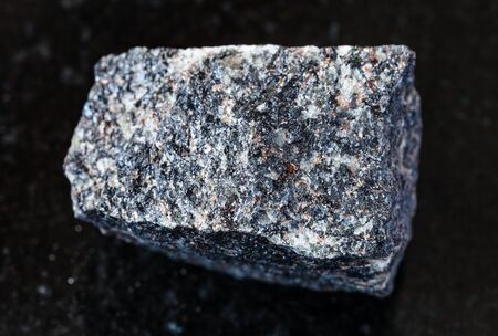 closeup of sample of natural mineral from geological collection - unpolished Nepheline Syenite rock on black granite background