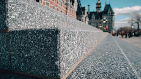 Close-up view of granite steps leading towards a building exterior. The textured gray stone contrasts with the blurred backdrop of a brick structure and blue sky. The composition emphasizes geometric forms and lines. Suitable for architectural, historical, or design-related content, the image offers visual interest and copy space.