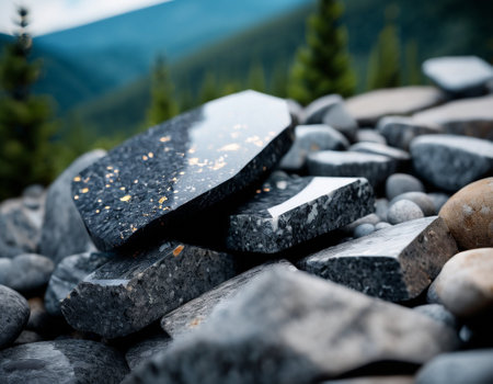 Beautiful cinematic mountain landscape with black marble and granite. High quality illustration