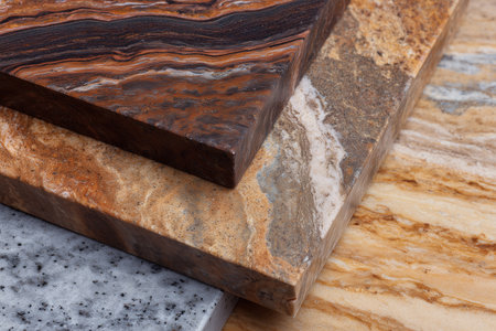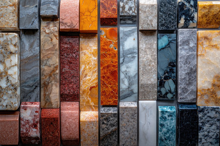 A variety of marble and granite samples arranged in rows, showcasing different colors and textures for interior design material selection. --ar 3:2 --stylize 750 --v 6.1 Job ID: 174cbc15-eb49-4a48-97da-5ff74c9f49ef