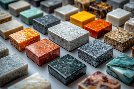 A stylish shot of square marble samples laid out on the table, showcasing different colors and patterns for interior design and flooring. The focus is on creating an elegant composition with natural stone material, emphasizing texture and color contrast in each block. --ar 3:2 --stylize 750 --v 6.1 Job ID: eb23c9a0-3456-47e4-9ec6-9e1f1f6d8681