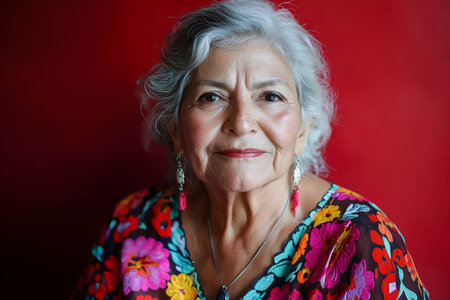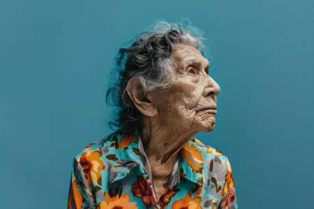 Studio portrait of a cheerful elderly hispanic woman with gray hair, wearing colorful sweater and earrings, posing against a vibrant turquoise backdrop