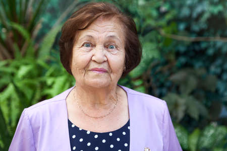 Senior Caucasian woman head and shoulders portrait against green plants, looking at camera