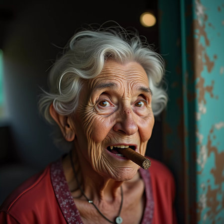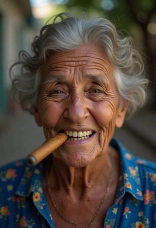 In the heart of Cuba, an elderly woman with silver curls proudly puffs a cigar, her radiant smile revealing stories of a rich, vibrant life filled with resilience and charm.
