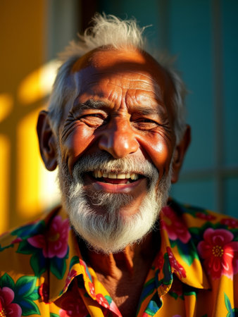 Joyful senior man smiling in colorful shirt with sunlit background.