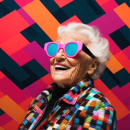 Portrait of a happy senior woman in sunglasses on colorful background.