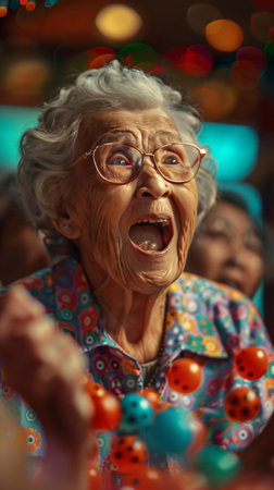 An elderly woman is delightfully dancing, raising her arms in a lively, colorful atmosphere, exuding joy and enthusiasm in a vibrant setting