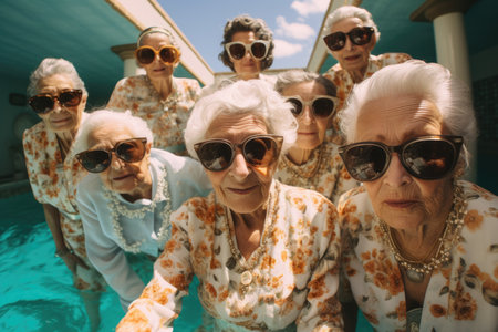 Joyful elderly senior woman dancing at beach party. Generative AI