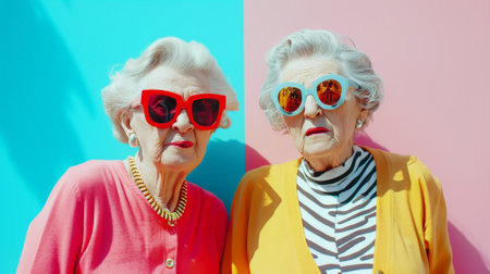 Two stylish older women dressed in bright street funky clothes, modern sunglasses on a bright pastel wall. Generative AI.