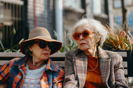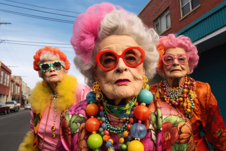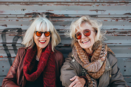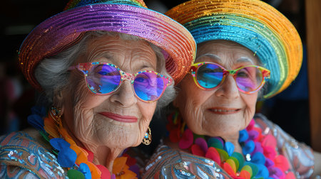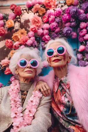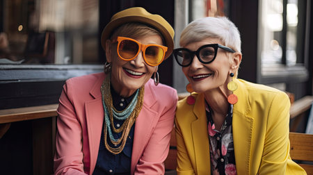 Two stylish senior women, their multi-colored hair and fashionable attire exuding youthful energy and joy