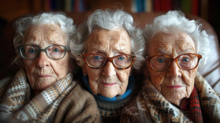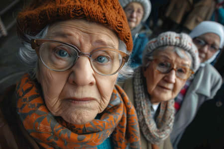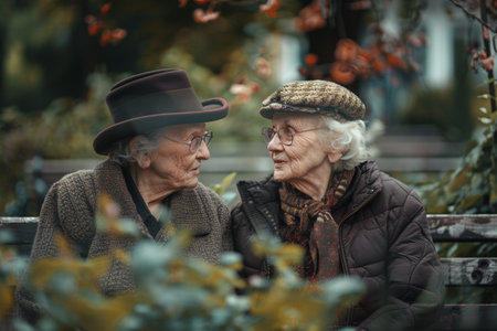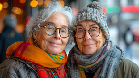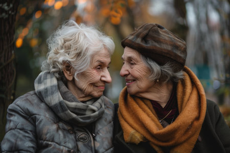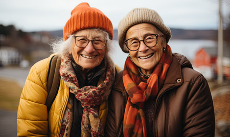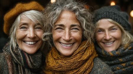 Elderly friends enjoying a happy moment with joyful expressions in warm attire
