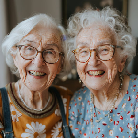 Elderly twin sisters in colorful tops and glasses smiling at the camera. They have gray hair and happy expressions. The photo is taken on an isolated white background.