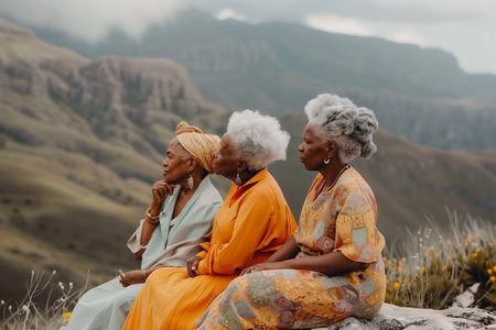 three senior black women sitting on a mountainside, back view of old ladies relaxing in the fresh air, family values concept