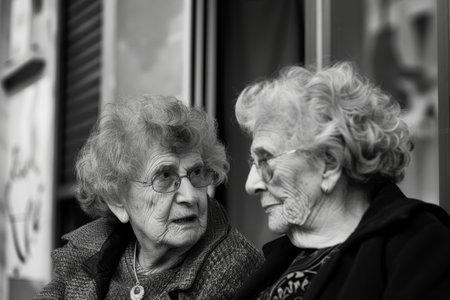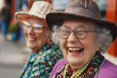 Two elderly women standing side by side, sharing a moment of laughter amidst a lively environment.