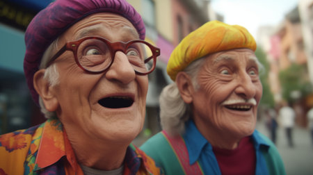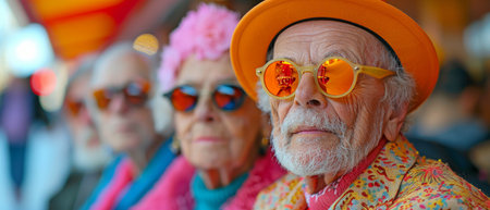 An eccentric and humorous elderly couple dressed in vibrant party wear. Concept of a contented senior living