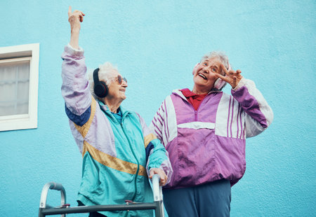 Two stylish elderly women with curly white hair and sunglasses are joyfully laughing together, showcasing their vibrant personalities. Their colorful outfits and headphones reflect a lively spirit, celebrating friendship and the joy of life in a bright, cheerful setting.