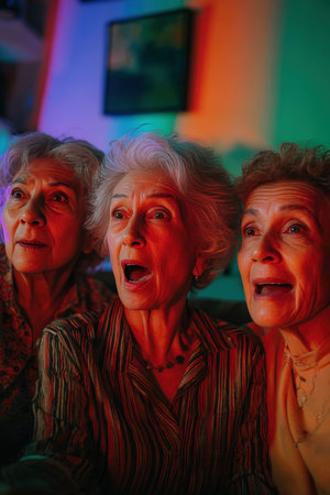 Three senior friends are illuminated by the glow of a TV, their faces full of excitement. The image features a cinematic color palette and warm tones, capturing a candid moment.