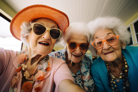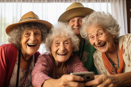 Heartwarming group selfie of happy senior friends embracing joy and togetherness, outdoors in the sunshine. Their smiles radiate pure happiness and friendship. Generated AI.